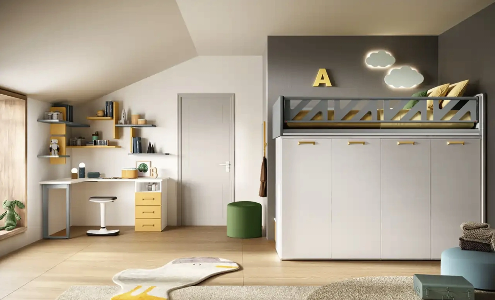 Con questa cameretta K109 Moretti Compact Camerette, tra le soluzioni a soppalco, potrai allestire stanze moderne per bambine.